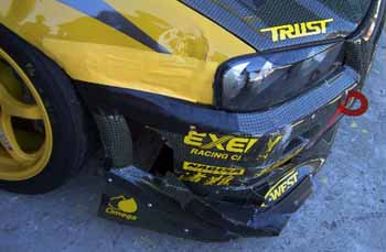 INラップでクリヤーを取りアタック開始しているようだった・・・しかし帰ってこない!その後赤旗中断となってしまった。聞き伝え情報では追突しているらしい?停止しているコース現場に行くと、他車と接触している様子、しかし停止してしまうほどのダメージは無い?僕がエンジン始動をするが問題なく始動する?しかしコース外に動かそうとすると動かない?良く見るとロアーアームが折れている。状況を車載ビデオで検証するとエボに低速コーナーのクリップ付近で被せられた様子、まさか来るとは思わなかったのだろう。右前と相手のドア辺りが接触していた。